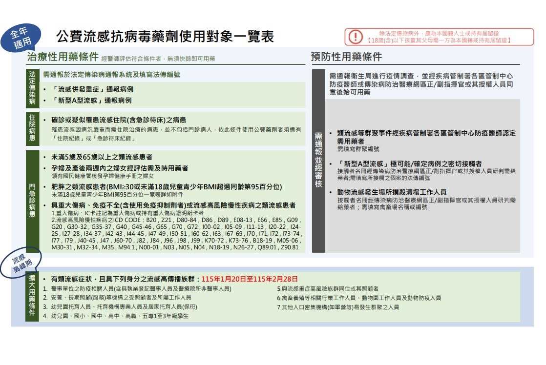 依衛生福利部疾病管制署(下稱疾管署)流感監測資料顯示,目前類流感疫情雖處相對低點但評估1月下旬將呈上升趨勢,且考量本(115)年2月春節連續假期,民眾南來北往恐造成疫情擴大,爰自本年1月20日起至2月28日止,公費流感抗病毒藥劑(下稱公費藥劑)增列「有類流感症狀,且具下列身分之流感高傳播族群」使用條件,並同步修訂「公費流感抗病毒藥劑使用對象一覽表」