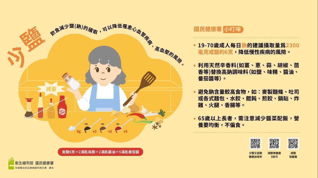 衛生福利部建議,成人每日鈉總攝取量不要超過2400毫克(即食鹽6公克),而一個人每日鈉的總攝取量=天然食物中鈉含量+加工食品與人工調味品中的鈉含量。大部分家庭主婦以為只要做菜時,少放點鹽就夠了,其實做菜用的其他調味品中也可能含有不少看不見的鹽或鈉,以及食用的加工食品裡亦有鹽或其他含鈉調味品的添加,累積起來一天當中很容易就會吃超過6公克的鹽。