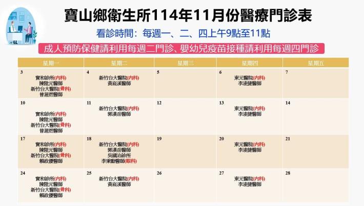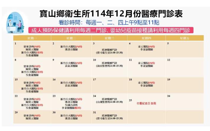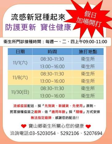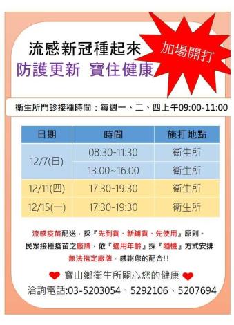 寶山鄉衛生所12月流感疫苗加場接種時間表