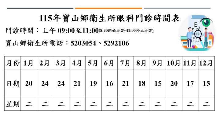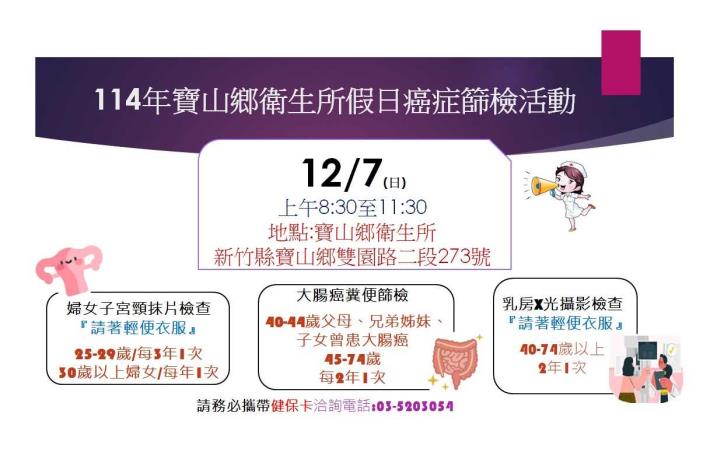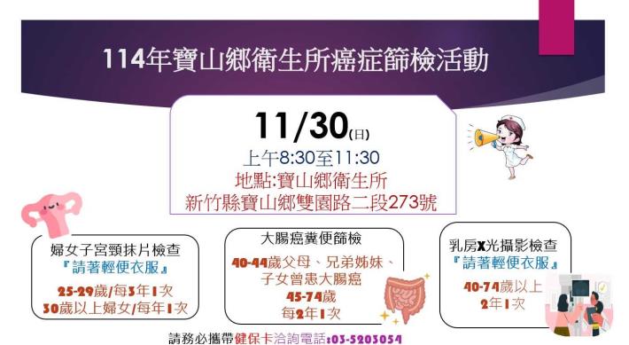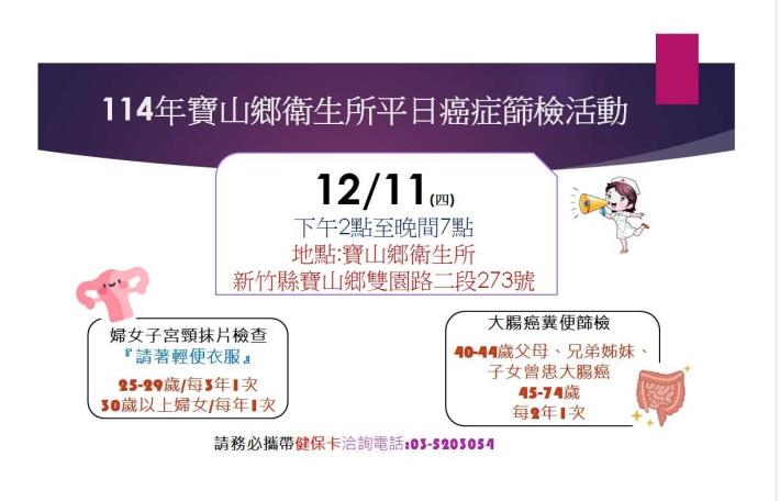114年寶山鄉衛生所社區癌症篩檢服務時間